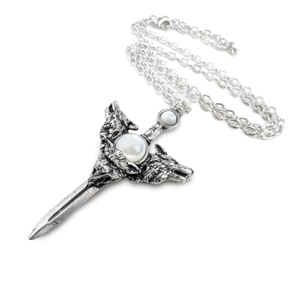 Pewter wolves' head and dagger pendant set with two moonstones.