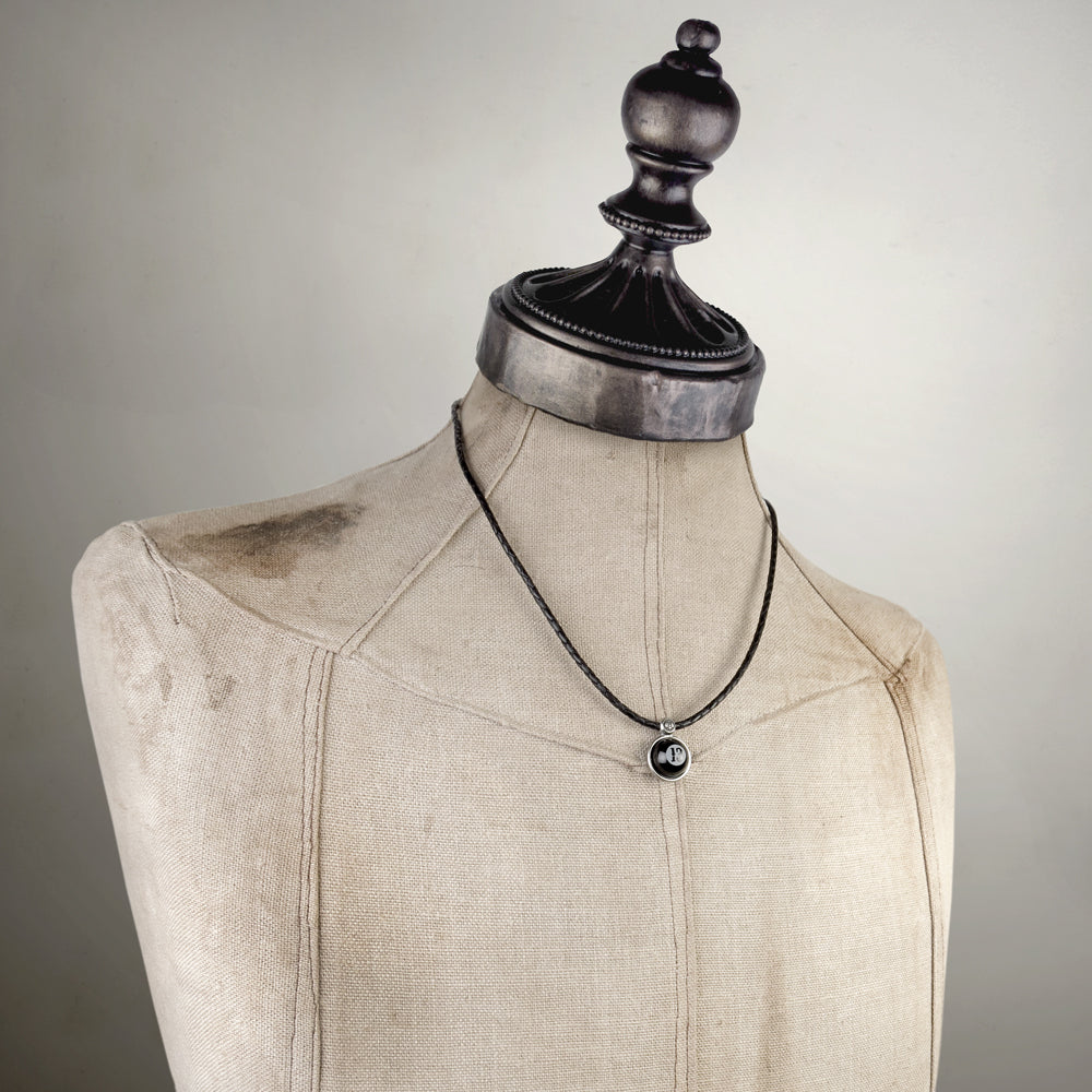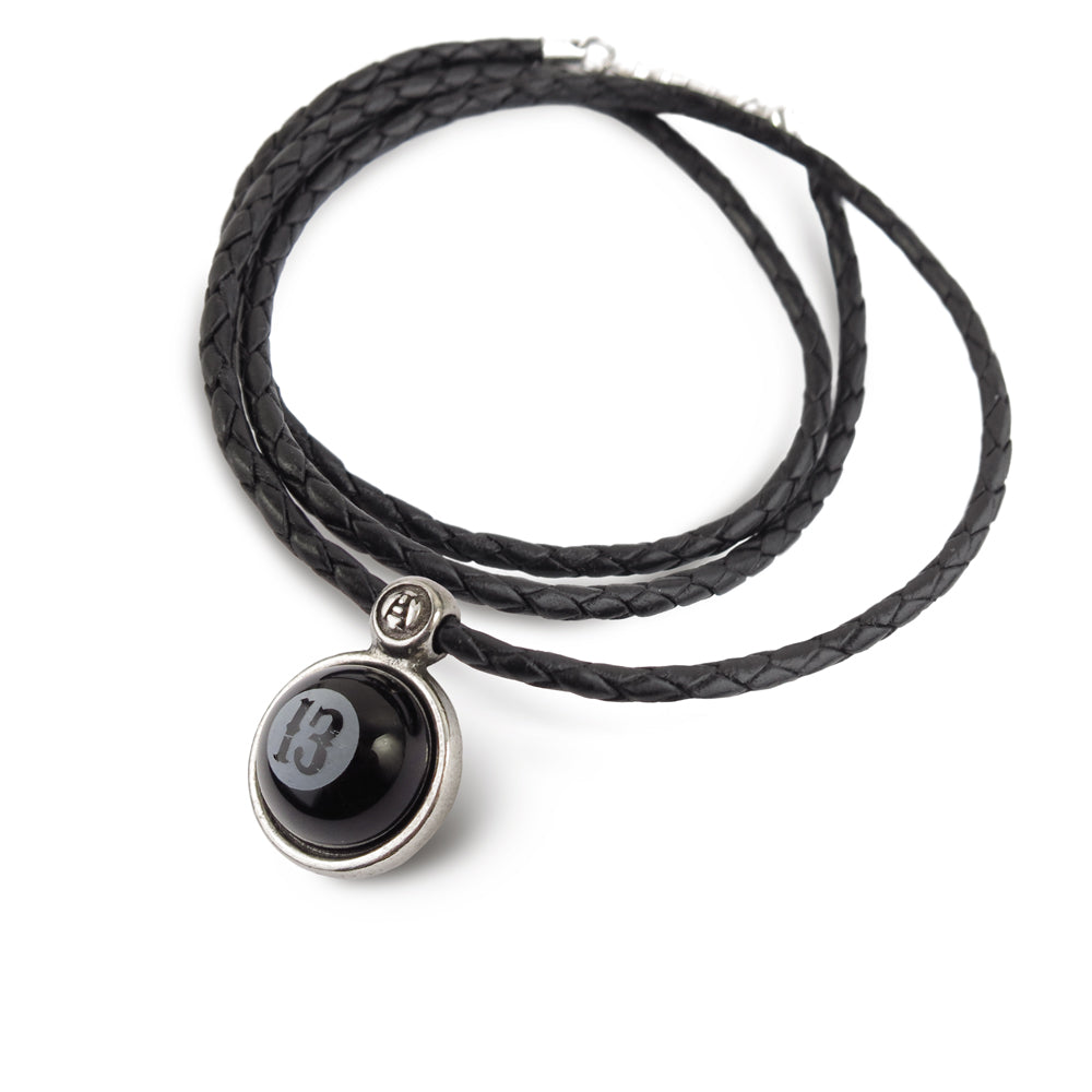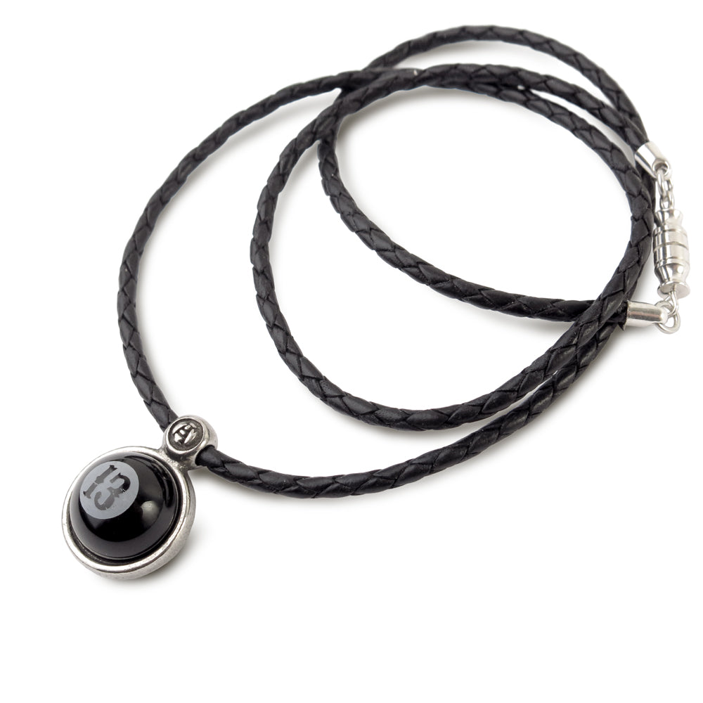 An alternative take on the classic '8 ball', with an etched black cabochon and fitted with a leather thong