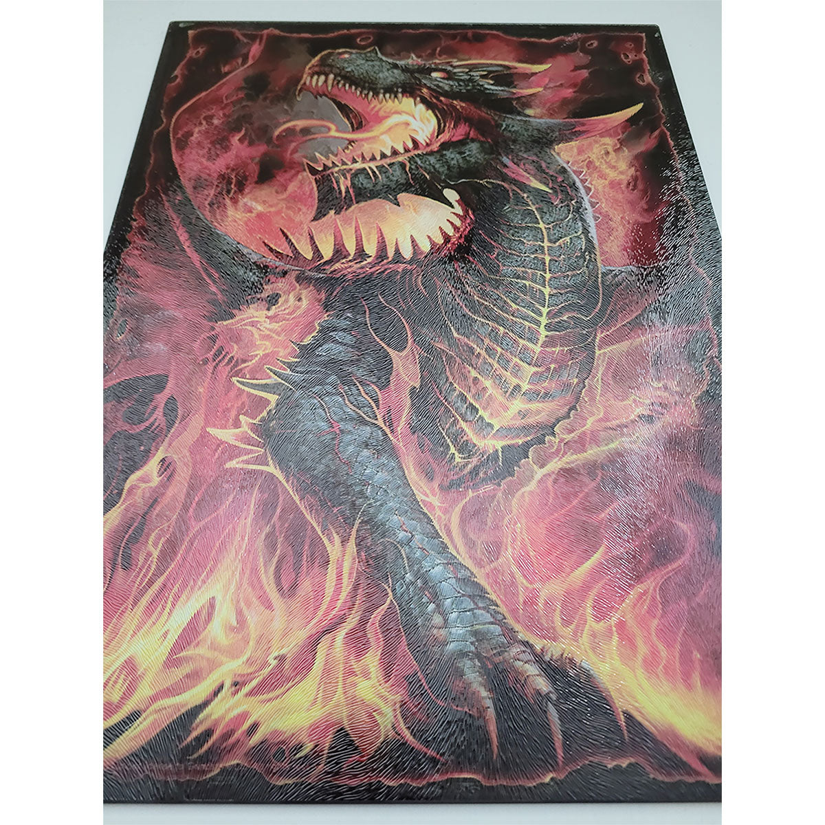 Wings of charred sulphur envelope the suffocating heat burning from within this dragon’s belly. Molten lava seeps from every crack along her body, dripping to the ground where furious flames whip and lick at her feet.