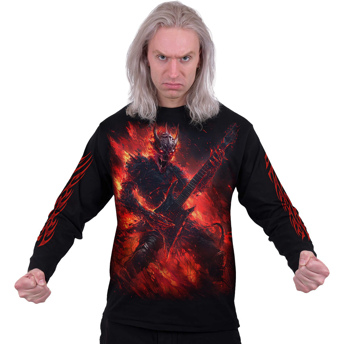 Male model wearing Riff Burner gothic Longsleeve T-Shirt in Black by Spiral Clothing