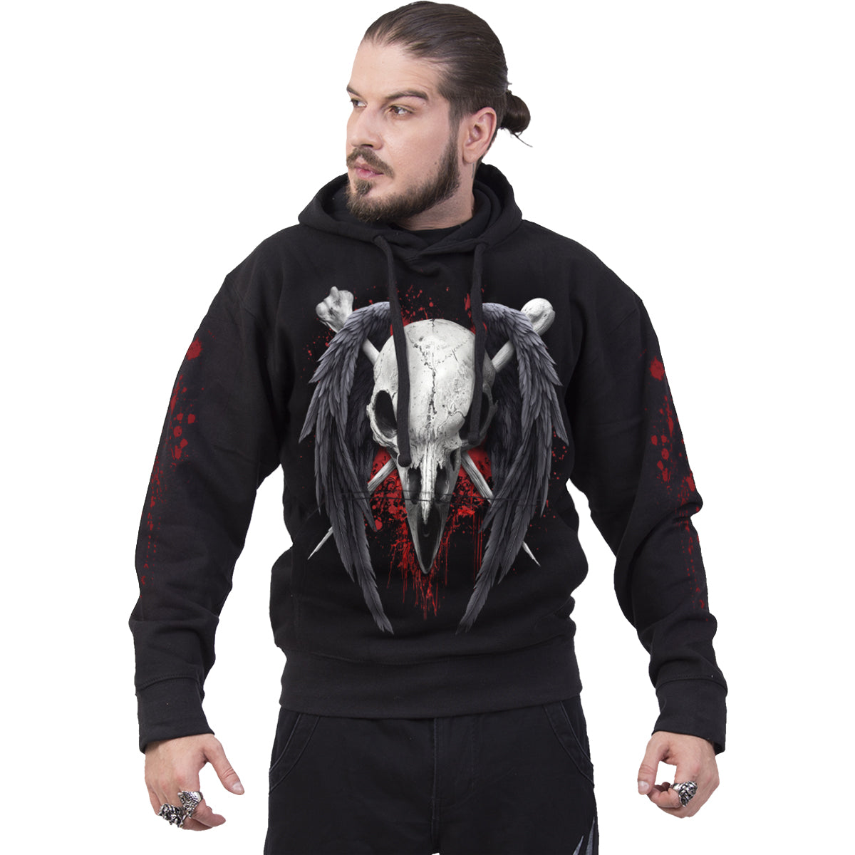 The abandoned, splintered bones of the long-deceased lay strewn across the earth, where the winged raptors of Death pick them clean to survive. A patient raven watches carefully, ensuring that no other bird dares to take its meal. This black and red skull 'n' crossbones design is the ultimate way to goth up any wardrobe.