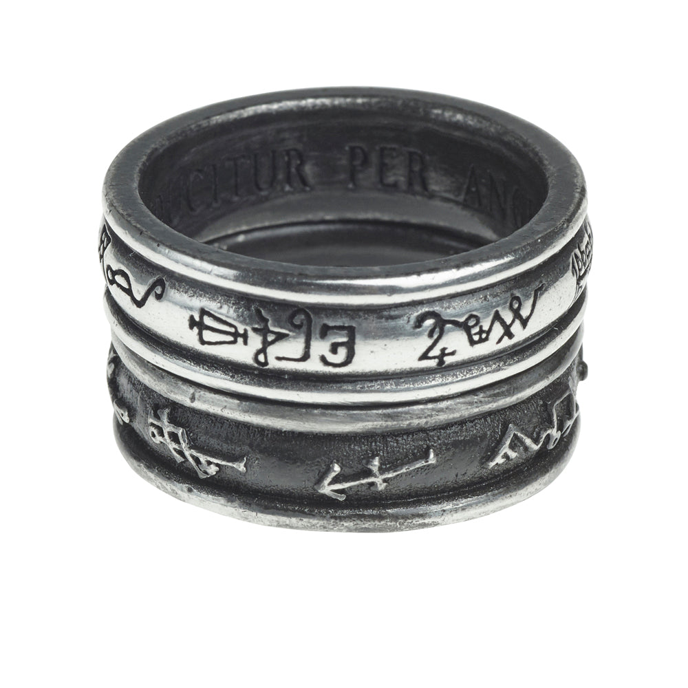 A pair of pewter band rings, each ¼" wide, one antiqued pewter and the other antiqued black, each inscribed with the symbols of seven angel's, (one raised and the other engraved), which can be rotated to align angels.
