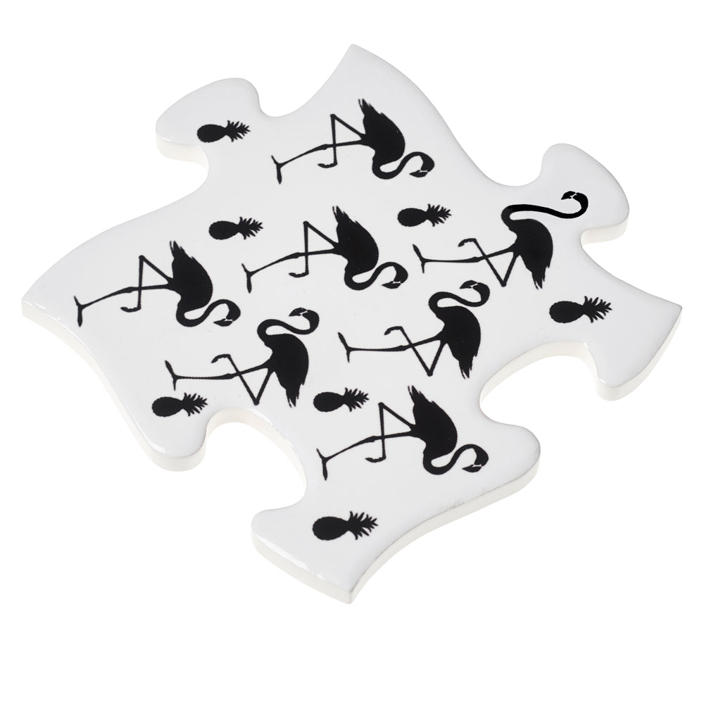 This unique 4 piece black flamingo and pineapple design jigsaw coaster set, can be used as individual coasters or joined together to used as a heatproof trivet. Its quirky design will look fabulous in any room of your home and will certainly get your guests minds working when figuring out how its put together!
